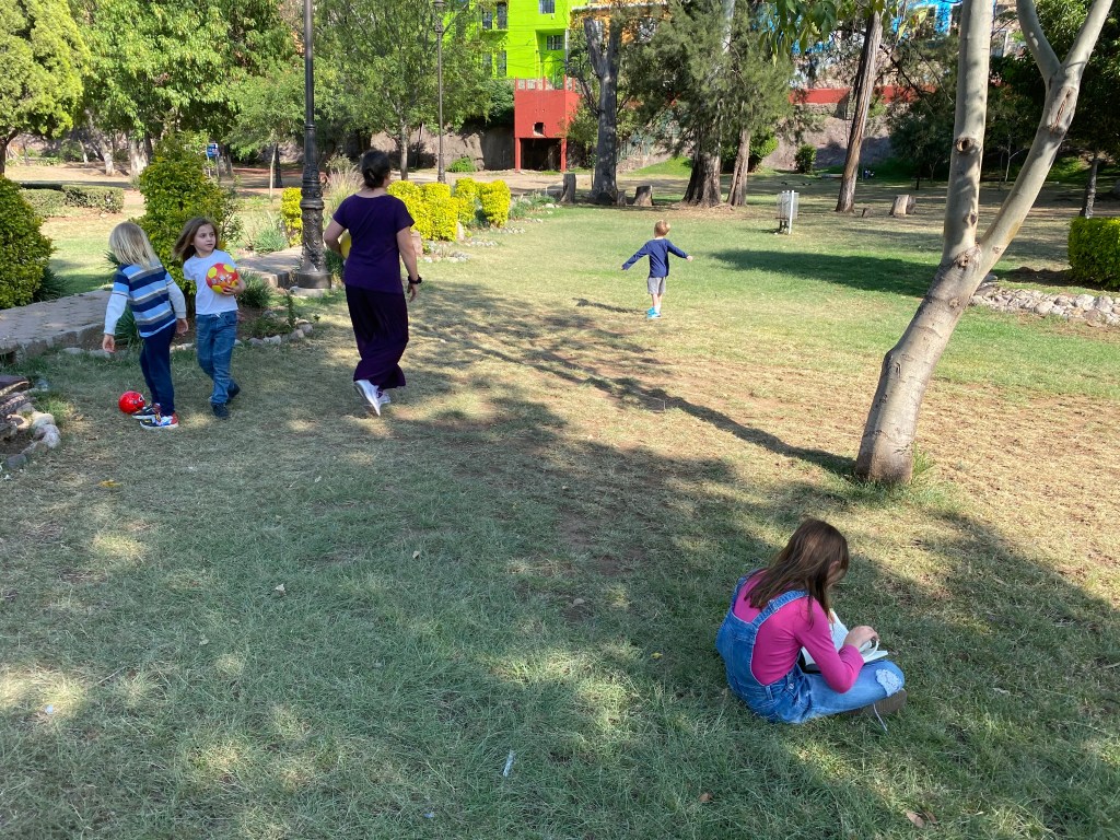 After lunch we drove around town looking for a park. We would not stop if the park had people in it. Low and behold we found an abandoned grassy area for us to ply soccer in. It was nice and peaceful, until we started competing. There was no one around thought and it gave the kids some much needed physical activity.