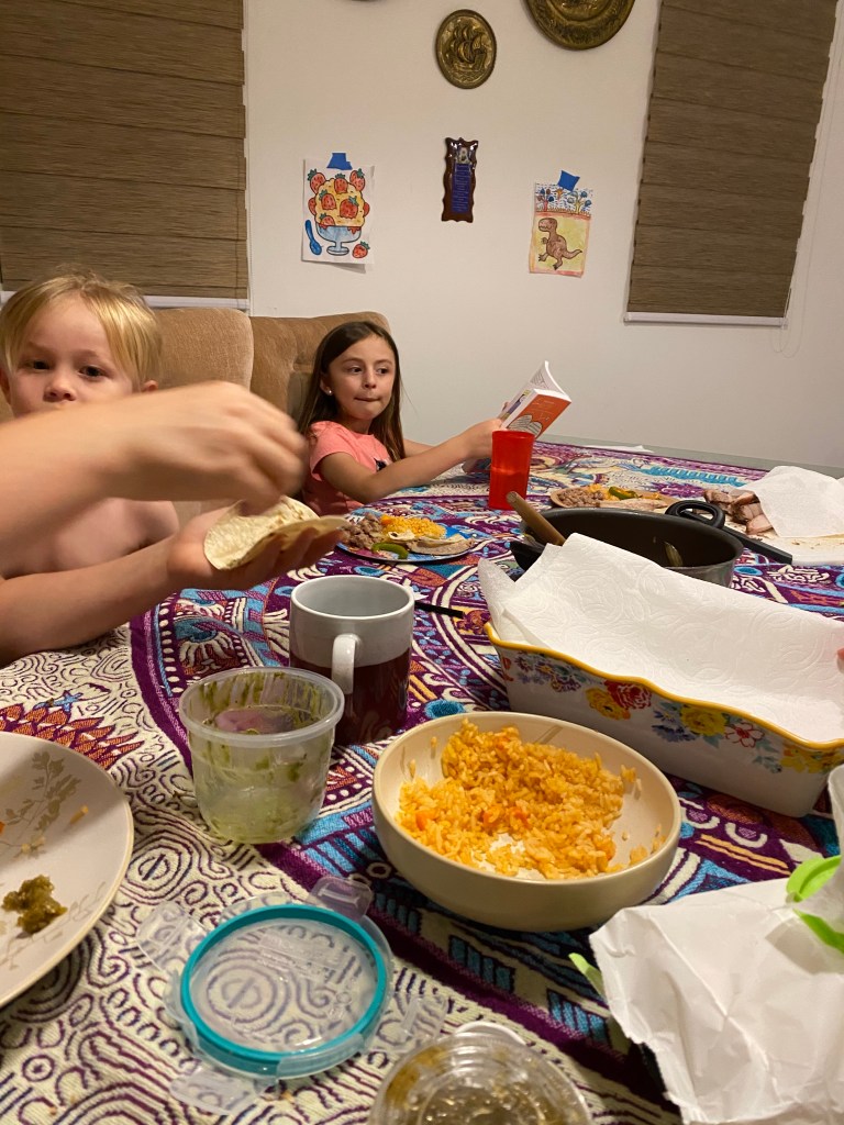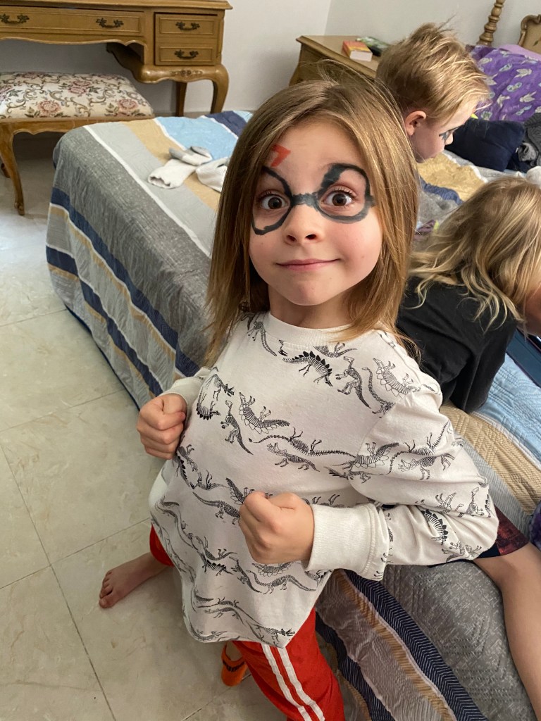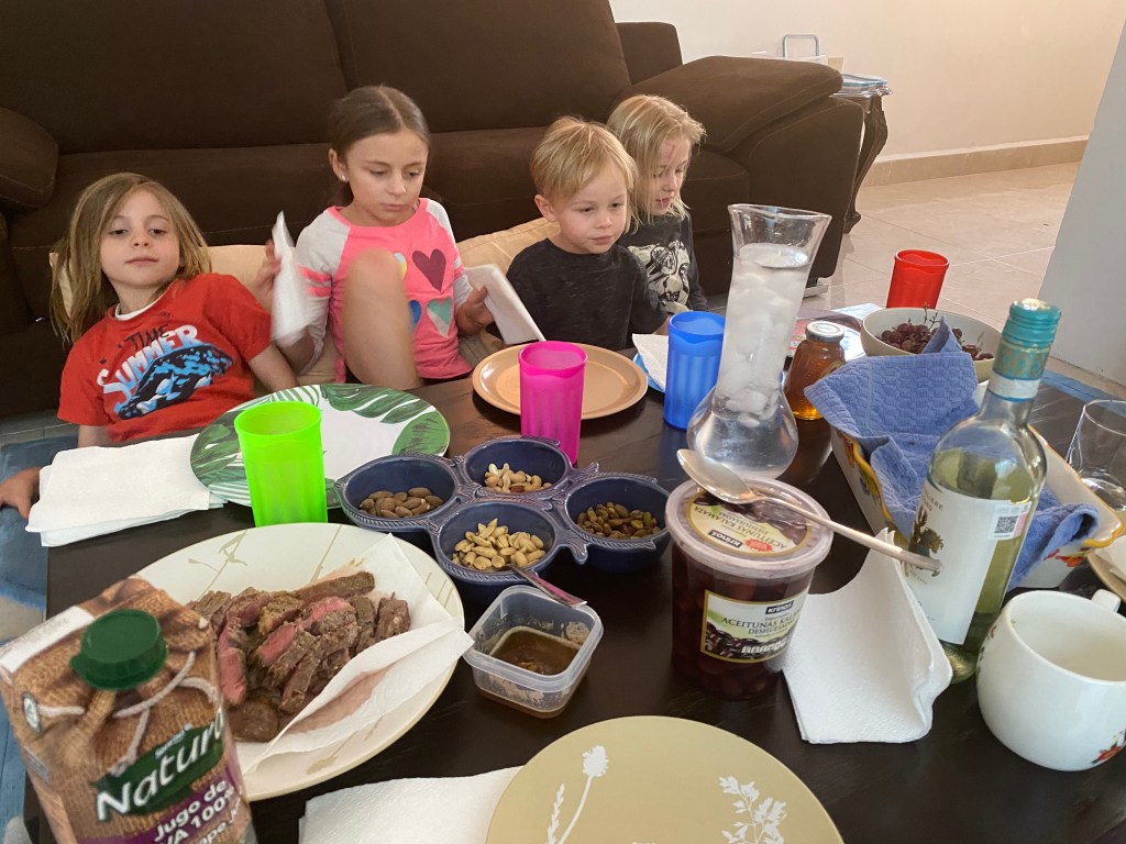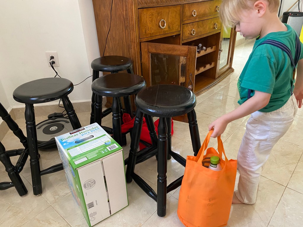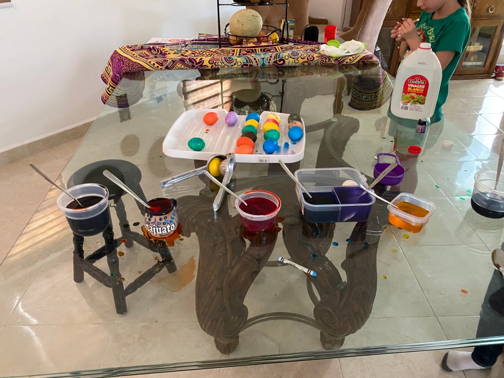 We celebrated Easter today. We stayed up very late and woke up very early. Growing up, my parents would get us Easter baskets and we would wake up with a jelly bean trail from our bed Tom our basket. So we have been doing that with our kids. We couldn’t find jelly beans here and with the shelter in place, didn’t feel like driving all over to find them. So we used chocolate eggs.