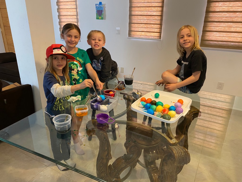 After the kids opened their Easter “bags” and ate way too much candy, we made pancakes and bacon, no eggs since we are going to be eating a lot of eggs these next few days. When breakfast was over we went to church.